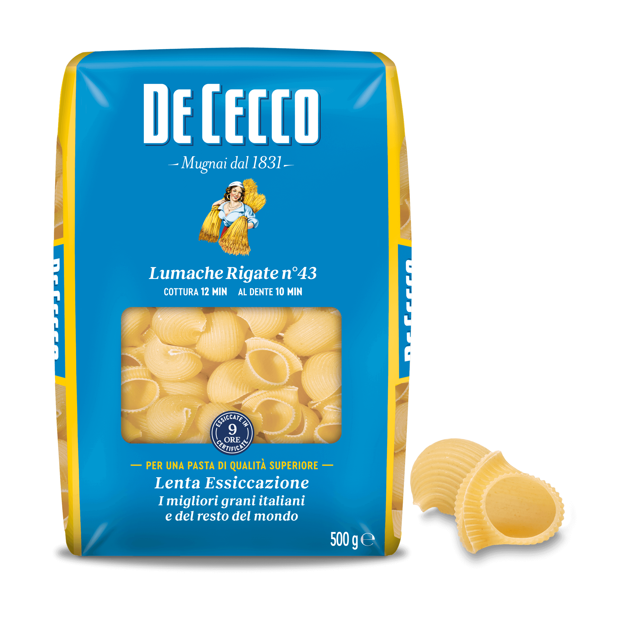 Lumache Rigate (grooved snails) are a delicious variation of the classic Pipe and have a whimsical shape which, thanks to the double-ended opening and the distinctive ridges, is perfect for mixing up with and capturing less dense, more liquid sauces. Lumache Rigate are especially good with ragù sauces made from pork or beef, sausages or mushrooms.